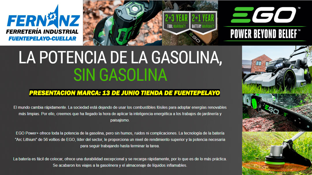 Es muy grato para nosotros invitarles a la jornada de puertas abiertas que celebraremos el próximo jueves 13 en nuestra tienda de Fuentepelayo, en la que presentaremos nuestra nueva marca de herramientas de jardín EGO, nº1 mundial en baterías. Se trata de una marca americana con la mejor batería del mercado, gracias a su tecnología de ARC-LITIUM de 56V, que es compatible para todas las máquinas de su catálogo, incluso para el tractor cortacésped y el giro 0.